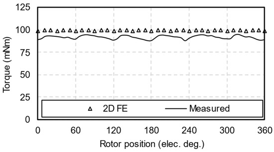 Figure 23 compares the measured and 2D FE-predicted rated torques. The measured average torque is 7% lower than its predicted counterpart, consistent with the analysis of measured back EMFs. Due to phase back-EMF distortions, the measured torque ripple was 7%. However, it should be noted that, although the prototype machine exhibited a higher torque ripple than the 2D FE-predicted result, its torque ripple is still much lower than conventional HCMs. Overall, the aforementioned analyses can be validated through experiments.