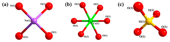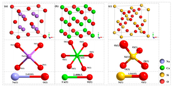 Initial cell structure diagrams of (a) Na2O, (b) CaO, and (c) SiO2.