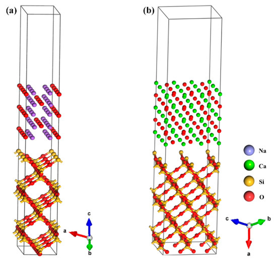 Crystal interface model: (a) Na2O(110)-SiO2(100); (b) CaO(100)-SiO2(100).