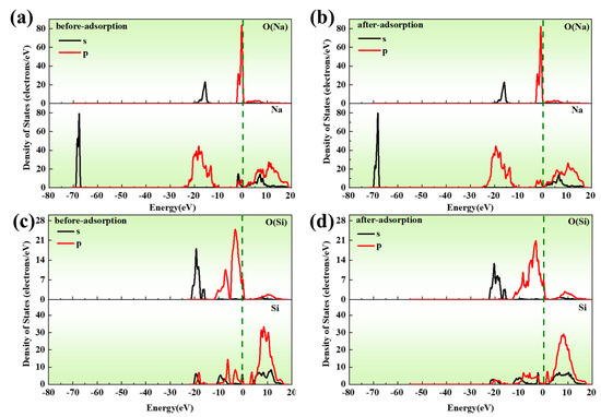 PDOS diagram of Na2O(110) adsorbed on SiO2(100) surface: (a) before adsorption of Na and O; (b) after adsorption of Na and O; (c) before adsorption of Si and O; (d) after adsorption of Si and O.