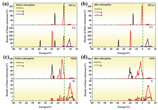 PDOS diagram of CaO(100) adsorbed on SiO2(100) surface: (a) before adsorption of Ca and O; (b) after adsorption of Ca and O; (c) before adsorption of Si and O; (d) after adsorption of Si and O.