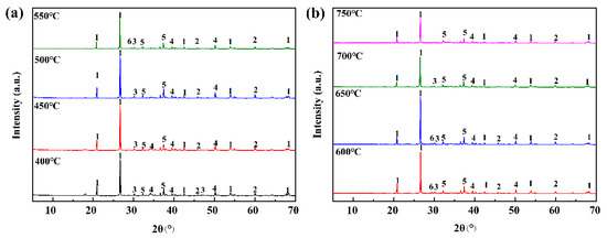 XRD patterns of the complexes at different combustion temperatures: (a) 400–550 °C; (b) 600–750 °C. 1—SiO2, 2—Na2Si2O5, 3—CaSiO3, 4—Na2CaSi3O8, 5—CaO, 6—Ca6Si4O14.