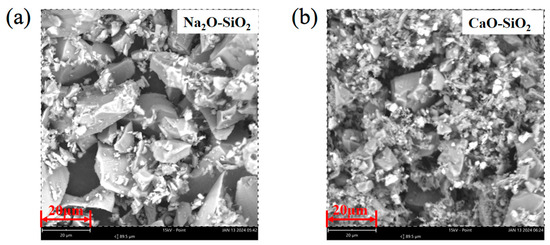 Figure 7 shows the SEM images of Na2Si2O5 and CaSiO3 models. It can be seen from the figure that the mineral morphology generated after the reaction of Na2O, CaO, and SiO2 is blocky. The previous thermodynamic calculation results also show that the Gibbs free energy change (ΔG) for the generation of sodium containing minerals in coal ash is smaller at 1000 °C and occurs more easily at high temperatures. The ΔG (−442.0 KJ/mol) of the reaction of Na2Si2O5 and Na2Ca2Si3O9 generated by the reaction of Na2O with SiO2 is significantly lower than that of wollastonite (−88.57 KJ/mol). The results demonstrate that the formation of wollastonite with high melting point is effectively inhibited by Na2O present in coal ash, ref. [35], indicating its preferred reaction with SiO2 before CaO. The results are in agreement with the simulation results.