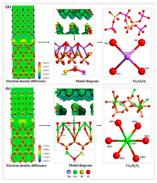 - Comparing the partial charge numbers of each atom in the two models, it is found that the O atom is negatively charged, while the Na, Ca, and Si atoms are positively charged. The charge numbers change after adsorption. The electron loss of Na is 0.05 e, and the electron loss of Ca is 0.03 e, indicating adsorption on the surfaces of both models. The electron loss of Na2O is greater than that of CaO, and it is prone to react with SiO2 to form silicates containing Na.