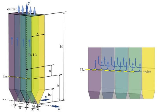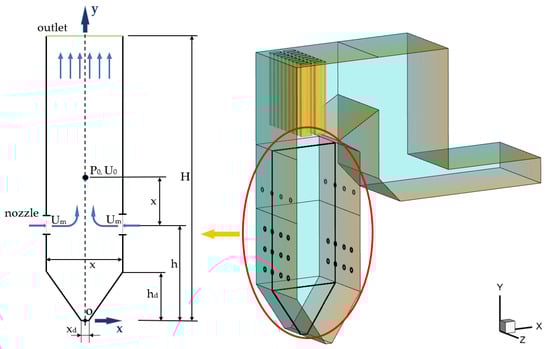 In this paper, a two-dimensional counterflow model with complete symmetry along the vertical centerline is abstractly simplified based on a tower furnace with a burner opposing arrangement, as shown in Figure 1. Because the focus of this paper is on the nonlinear characteristics of the fluid flow, the model is simplified to consider only an arrangement with a pair of opposing burners, despite the actual boiler having multiple layers of burners. This study is limited to the cold state and a single phase, assuming uniform air intake for each burner (with no distinction between primary air and secondary air) and temporarily excluding the air intake of the SOFA air burner of the actual boiler.