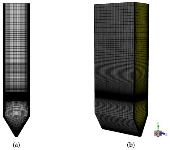 Mesh generation is executed utilizing the ICEM 19.2 software, employing a structured quadrilateral mesh for the discretization of the computational domain. Specific attention is given to the near-wall region and the burner nozzle area, where local mesh refinement is implemented to accurately capture the flow dynamics and thermal gradients in these critical zones. The mesh configuration is illustrated in Figure 3, providing a visual representation of the spatial discretization strategy adopted. This approach ensures that the numerical simulations are both accurate and efficient, facilitating a detailed analysis of the flow and thermal phenomena within the studied system.