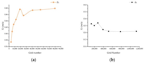 Grid independence verification. (a) Velocity distribution at point P0 in the 2D model; and (b) velocity distribution at point P0 in the 3D model.