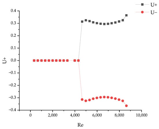 Figure 5 illustrates the variation of the dimensionless velocity component U in the x direction with Re at the monitoring point P0. U, U+, and U- are dimensionless velocities. When the actual velocity u is greater than zero, indicating that the velocity at the monitoring point is directed towards the positive X-axis, the dimensionless velocity U is greater than zero. In this scenario, U is denoted as U+ in Figure 5. Conversely, when the actual velocity u is less than zero, indicating that the velocity at the monitoring point is directed towards the negative X-axis, the dimensionless velocity U is less than zero. In this scenario, U is denoted as U- in Figure 5. As seen in Figure 5, when Re < Rec1 = 4652, the numerical solution is a unique symmetric solution. When Rec1 < Re < Rec2 = 8639, two asymmetric numerical solutions and one unstable symmetric solution emerge, indicating a tuning fork bifurcation. When Re > Rec2 = 8639, the numerical solution becomes oscillatory, and eventually chaotic, leading to a Hopf bifurcation.