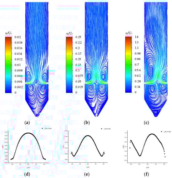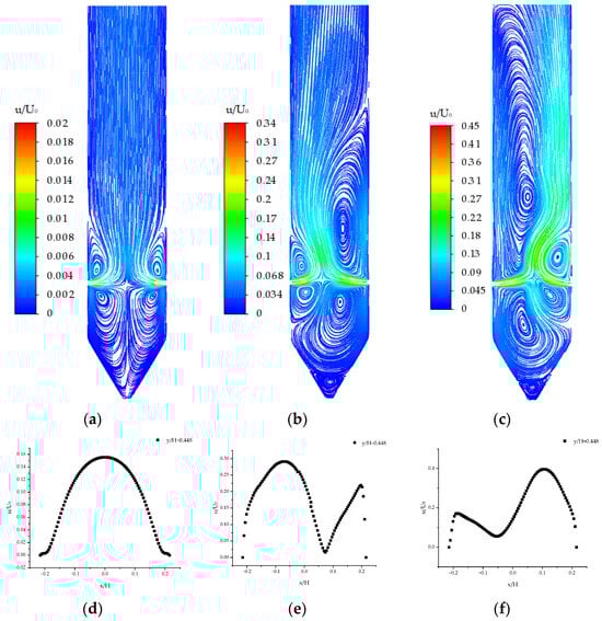 The streamline diagram and velocity distribution of the y/H = 0.448 cross-section simulated by the laminar flow model: (a) Re = 332; (b) Re = 4320; (c) Re = 4652; (d) Re = 332; (e) Re = 4320; and (f) Re = 4652.