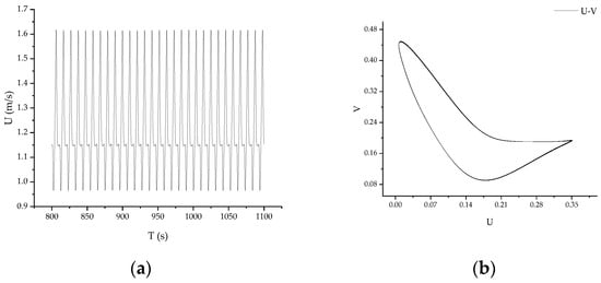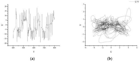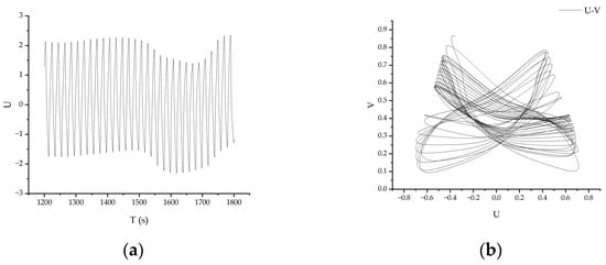 When Re is further increased to Re = 87,627, the internal motion characteristics of the flow system show strong instability. The velocity time series of the flow oscillates more intensively, as shown in Figure 10a, indicating that the flow within the model is in a state of intense chaos. Figure 10b shows the shape of the chaotic attractor in the phase space of non-periodic oscillation. At this point, the chaotic attractor, also known as the strange attractor, exhibits a very complex and variable trajectory structure in phase space. The flow inside the model displays complex instabilities. From the U-V phase diagram, the chaotic attractor is globally stable, and all other trajectories converge into the chaotic attractor. However, in some regions, the trajectory of the chaotic attractor is extremely unstable, with adjacent trajectories mutually exclusive and exponentially separated. Generally, the chaotic attractor exhibits self-similarity with infinitely nested levels, forming an aggregate of many infinite points in phase space.