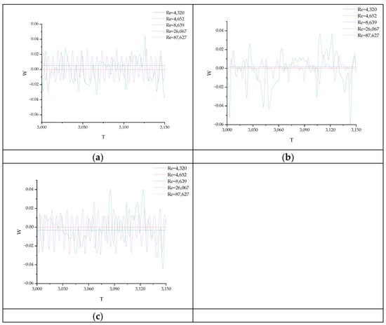 The time series of the dimensionless velocity component W in the Z direction under different Re conditions at different monitoring points: (a) Z = −0.2; (b) Z = 0; and (c) Z = 0.2.