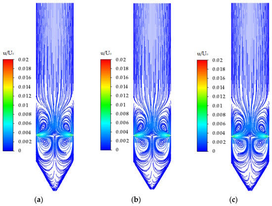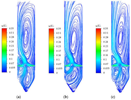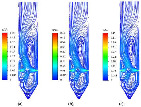 Figure 6a–c show the streamlines obtained by the numerical simulation of the laminar flow model at Re = 332, 4320, and 4652. Figure 6d–f show the velocity distribution curve of the y/h = 0.448 cross-section in the model corresponding to these Re values. From Figure 6a,b,d,e, it can be seen that in the range of 332 < Re < 4320, the cross-sectional velocity distribution in the two-dimensional counterflow model is perfectly symmetrical with respect to the axis of symmetry X = 0. After the numerical solution changes with time in the initial stage, it reaches a steady state and no longer changes with time, resulting in a unique, symmetric, and steady-state solution.