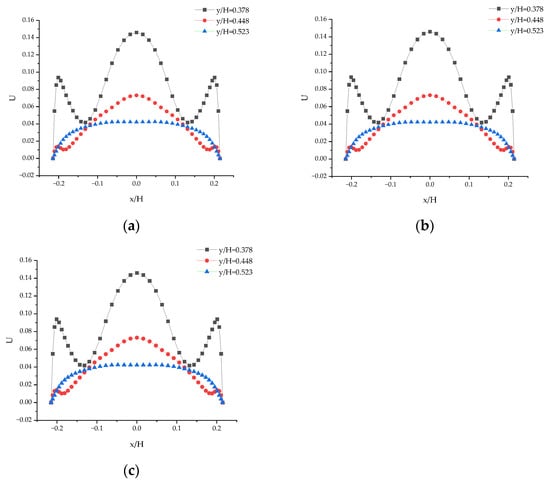 By examining the distribution curves of the dimensionless velocity U in Figure 13a–c, it is evident that the velocity distribution remains almost perfectly symmetrical, indicating a high stability and symmetry of the flow at lower Reynolds numbers. The flow characteristics in the 3D model are the same as those in the 2D model. This means that, under certain conditions, three-dimensional problems may have two-dimensional solutions, making the theoretical two-dimensional solutions applicable to the three-dimensional experimental results.