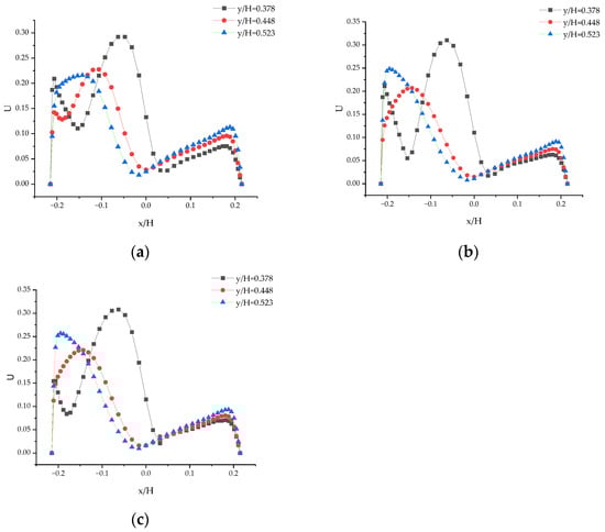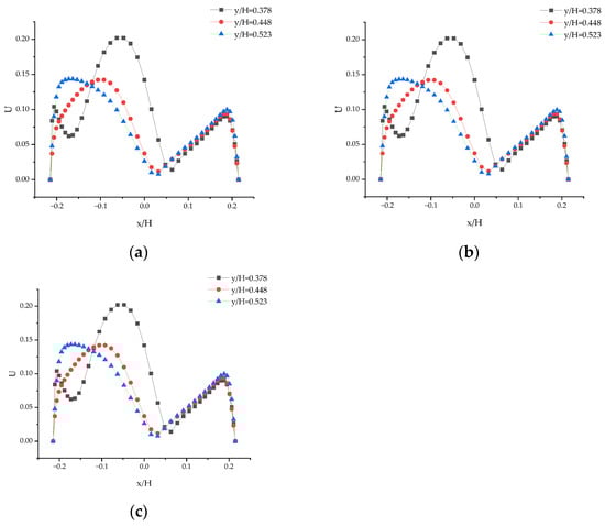 Figure 16a–c display the distribution curves of the dimensionless velocity component U for three Z-axis cross-sections (Z = −0.2, Z = 0, and Z = 0.2) at Re = 87,627. Correspondingly, Figure 17a–c depict the dimensionless velocity distribution on these cross-sections.