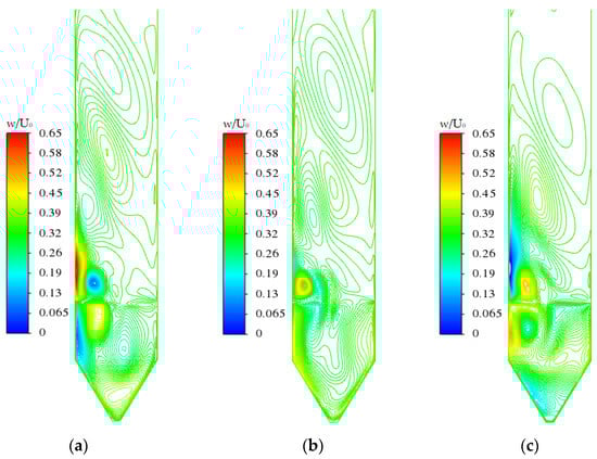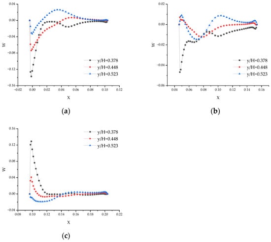 Velocity distribution in the Z direction on different sections when Re = 87,627: (a) Z = −0.2; (b) Z = 0; and (c) Z = 0.2.