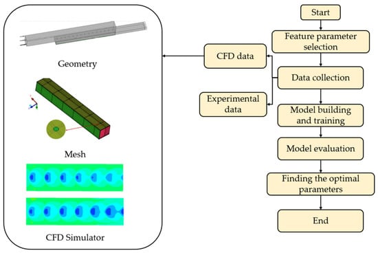 To optimize the shape of the pin fins, it is necessary to make a more accurate prediction of the heat transfer coefficients. Kwon et al. [26] conducted ML for channels with different numbers and shapes of pin fins. Using six feature parameters as inputs and 243 sets of data to train the model, a random forest model was constructed with the objective of accurately predicting the local convective heat transfer coefficients in the cooling channel. While a substantial quantity of precise data can ensure the precision of the prediction, the computational resources and time required must be considered. Proxy models are simplified models that are employed to approximate complex systems with the objective of reducing the consumption of computational resources while maintaining an appropriate level of accuracy. These models can rapidly provide approximate results for costly or time-consuming tasks through simplified, data-driven methods, optimization and fitting techniques, and accurate error assessment.
