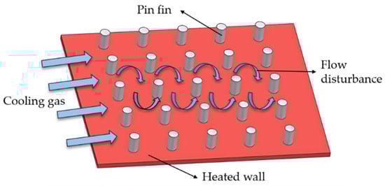 The application of pin fin cooling facilitates the transmit of heat within the channel by utilizing spoiler columns positioned within the walls on either side of the channel. The positioning of the pin fins at the trailing edge of the blades allows for an increase in the turbulence of the cooling airflow, as well as the dissipation of heat from the blade surface by the pin fins. The airflow passing through the pin fins creates a wake that increases the flow disturbance and destroys the wall boundary layer, thus improving the heat transfer efficiency. Meanwhile, the pin fin acts as a heat conductor, and the heat on the blade wall surface is transferred to the pin fins, and then the heat is removed by the cooling airflow. The pin fin cooling principle is shown in Figure 6.