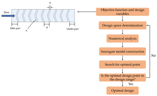 Under the effect of rotation, the coolant flowing through the finned cooling channel is subjected to a large Koch force and rotational lift. Under the action of these forces, a secondary flow is induced in the channel, causing an asymmetry in the main flow distribution. The intrinsic rotational force affects the heat transfer by changing the flow field and thus. Moon et al. [54,55] optimized a rectangular ribbed triangular channel under rotation. The rib angle (α), the ratio of rib spacing to hydraulic diameter (P/Dh), and the ratio of rib width to hydraulic diameter (b/Dh) were selected as design variables. Figure 8 is a flowchart of a rectangular ribbed triangle channel optimization. The results show that the target function value of the optimized structure is improved by 21.5%.