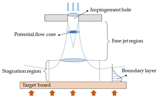 The jet impingement cooling technology was proposed in the 1960s, and the detailed concepts of it were explored by Bradury [56]. In this approach, Sparrow and Wong [57] examined the mass transfer distribution of a single jet impingement. Figure 9 shows the impingement flow distribution of the single-hole jet. The jet stage can be divided into the core area, the development area, and the stable area. When the airflow reaches the target surface, the airflow diffuses around the stagnation point. The heat transfer performance distributes along the radial direction, and the distribution trend is related to the jet distance. Impinging jets are the most useful method for improving the local heat transfer coefficient, but they have a slight adverse impact on the structural strength of turbine blades. It is clear that impingement cooling is the most suitable solution for the front edge of the turbine blade because this part is the place with the thickest blades and the highest heat load. Meanwhile, the strength requirement in the static blade is not as high as that of the rotating blade, so impact jet cooling is also used in the chord area of the static blade. Unlike the single jet hole, the scattering of the jet in the chord region causes the transverse flow. Koopman and Sparrow [58] scrutinized the influence of transverse flow on jet rows. Considering that the shape of the nozzle, the arrangement of the nozzle holes, the shape of the chamber, and the shape of the target surface all affect the distribution of the heat transfer coefficients [59], this part investigates the application of intelligent optimization algorithms in jet impingement cooling.
