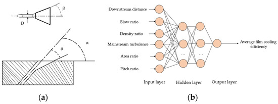 Application of artificial neural networks in film cooling efficiency modeling: (a) geometry of film hole; (b) network structure.