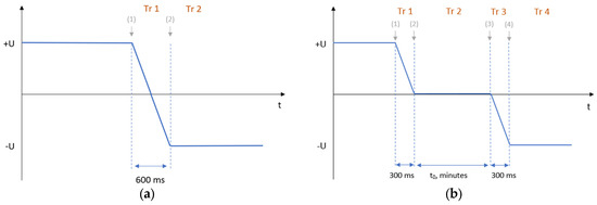 Voltage polarity reversals (VPRs) are transient events in HVDC cable systems that use line commutated converters (LCCs) to reverse the power flow in the electrical grid. Fast VPR events take place as a response to serious contingencies to keep the grid frequency within its operational limit in both unsynchronized and synchronized grids, while slow VPRs are scheduled transient events that aim to reverse the power flow to meet the electricity market’s needs [8]. As the fast VPR events are linked to contingencies, they are not frequent in HVDC systems, unlike the slow VPR events, which are linked to frequent variations in the electricity market. In fast VPRs, the voltage is switched off and reversed from U0 to −U0 within a few hundred milliseconds, as shown in Figure 1a between the time markers (1) and (2), creating two electric field transients, Tr 1 and Tr 2, due to the residual space charge accumulated before the VPR under DC voltage. In slow VPRs, the voltage is switched off, from U0 to 0, within few hundred milliseconds during Tr 1 (1) → (2), and then the voltage is kept at 0 for some minutes during Tr 2 (2) → (3), followed by a voltage reversal from 0 to −U0 within a few hundred milliseconds during Tr 3 (3) → (4). The period at which the voltage is kept at zero (t0) serves as a relaxation period for the space charge accumulated in the cable insulation, revealing the electrical stress to which the cable is subjected during Tr 4, as shown in Figure 1b.