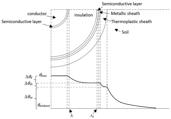 where r is the generic radial coordinate in cable insulation, is the thermal resistivity of the insulation, T is the temperature, and is the per-unit volume power generated due to insulation losses, which is neglected under design electric field strengths and temperatures [18]. The thermal properties of the cable and the environment are reported in Section 3. A cross-section of the cable is shown in Figure 2 highlighting the main temperature drops in the cable’s thermal circuit, i.e., the insulation, thermoplastic sheath, and soil.