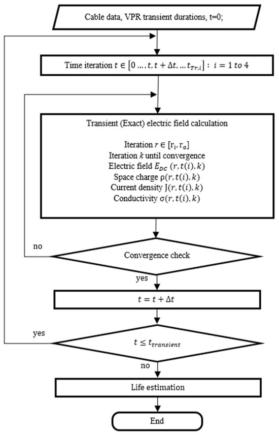 The electric field in the insulation is calculated numerically by solving Gauss, ohm, and current continuity equations (Equations (2)–(4)) in addition to the macroscopic conductivity Equation (5), which macroscopically describes the relationship between the conductivity from one side and the temperature and the field from the other side. Figure 3 shows a flowchart of the transient electric field calculation during the VPR transients.