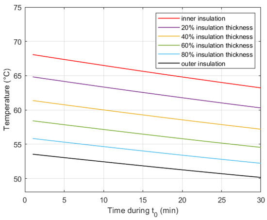 Temperature distribution within the insulation thickness during 30 min of the zero-voltage period of the slow VPR.