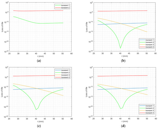 The loss of life of the case-study HVDC cable during all transients of (a) 1 fast VPR, (b) 1 slow VPR with t0 = 10 min, (c) 1 slow VPR with t0 = 20 min, (d) 1 slow VPR with t0 = 30 min. The transients 1, 2, 3, and 4 are defined in Figure 1.