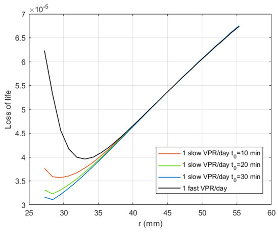 Figure 7 presents the total loss of life during the steady state and all transients (1 VPR/day) estimated according to Equation (10) for the fast (black curve) and slow VPRs, considering t0 = 10, 20, and 30 min (red, green, and blue curves, respectively). It can be noticed that both the fast and slow VPRs stress the inner insulation, although the outer insulation is still the most stressed point in all cases. One fast VPR/day makes the loss of life at the inner insulation just lower that that at the outer insulation, while one slow VPR/day has a lower effect on the loss of life of the insulation. The latter effect becomes lower when t0 increases until it becomes barely noticeable for t0 = 30 min.