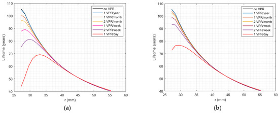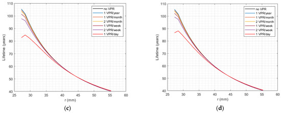 The life of cable subjected to different numbers of VPRs, ranging from 1 VPR/year to 1 VPR/day, (a) fast VPR, (b) slow VPR with t0 = 10 min, (c) slow VPR with t0 = 20 min, (d) slow VPR with t0 = 30 min.