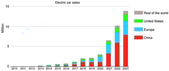 Progressive increase in EV sales throughout the world, especially in the USA, China, and Europe, between 2010 and 2023 [2].