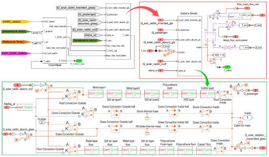 The cabin shield was divided into four boundary zones, windows, lateral frame, roof, and floor, to account for the impact of convection and conduction heat transfer between the cabin and the external environment. A thermal layer model was created in Simscape™ for each zone. The convective heat transfer coefficient for the inside was kept constant, while for the outside, a function (Equation (14)) based on the vehicle’s actual speed was used, as described in reference [40].