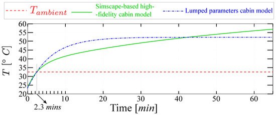 Cabin’s temperature evolution obtained through (green) Simscape™ cabin thermal model; (blue) lumped-parameter cabin thermal model.