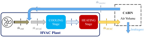 The cabin’s energy budget should consider the inward and outward air mass flow rates. The HVAC system regulates the temperature inside the cabin by blowing a controlled air mass () into the cabin. Additionally, a mass flow rate of the cabin’s air is recirculated () and exits the cabin. Finally, there are air leakages () towards the external environment that may occur due to imperfect sealing of the cabin’s shield. All of these contributions have been considered, considering the respective temperatures of the different air fluxes.