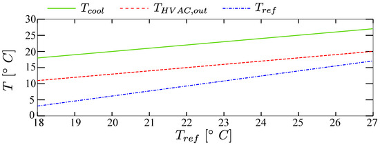 The recirculated mass flow rate, i.e., , has been designed as a constant portion of the mass flow rate blown inside, i.e., . The rule for the temperature at the outlet of the cooling stage has consequently been designed to fulfill such requirements. Lastly, the temperature of the air directly blown into the cabin has been set 8 °C below the temperature desired. The two internal rules are displayed in Figure 5.