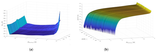 A new battery model has been developed, distinguishing itself from similar research by focusing on the battery’s characteristics. Using results from previous research on battery capacity deterioration, as found in [47], a description of the battery’s characteristics has been extracted. This description includes the variation in the battery’s open circuit voltage (OCV) and internal resistance, corresponding to two variables: the state of health (SOH) and the state of charge (SOC). These characteristics, over their respective domains, can be observed in Figure 6a,b.
