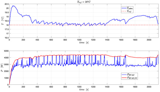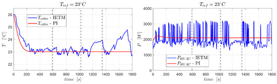 From the profiles depicted in Figure 8, one can confirm the fairness of the IETM controller by observing how the temperature evolves corresponding to the HVAC power’s variation. Although the former is a clear consequence of the latter, the power trajectory oscillates because of Equation (25), which is the cost function for the IETM controller.
