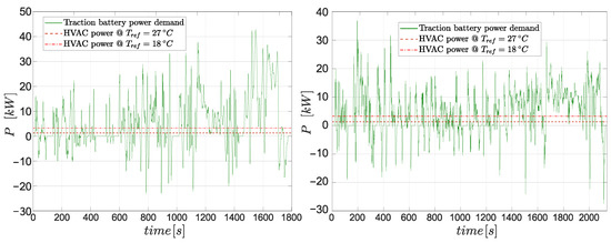 Battery loads in scenario 1 and scenario 2: traction power demand (green) and HVAC battery load to keep constantly 18 °C and 27 °C inside the cabin.