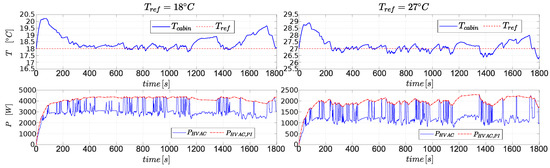 Temperature profile (upper panel) and HVAC power profile (lower panel) resulting from using the IETM controller with a reference temperature of 18 °C (left hand) and 27 °C (left hand) in driving scenario 1.