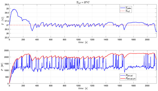 Temperature profile (upper panel) and HVAC power profile (lower panel) resulting from using the IETM controller with a reference temperature of 27 °C in driving scenario 2.