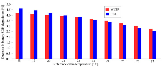 The results, expressed in percentage, represent the additional battery capacity found for the battery pack at the end of the 160,000 km using the IETM strategy, as compared to the same distance traveled without the assistance of the controller. The improvements, ranging in the interval between 3.1% and 4.5%, are in line with what one could have expected by such a strategy. Indeed, this is neither a strategy acting on the driving style, nor some improvement in powertrain efficiency. These could have returned higher improvements, minimizing the traction power, which would have meant having a range of values of power to act on that would be far larger than the one required by the HVAC. Aiming to explain the decreasing trend that occurs as the reference temperature within the cabin increases, this is due to the HVAC system’s increased energy consumption necessary to maintain lower temperatures inside the cabin. Then, the IETM control can work on a higher power margin, limiting the damaging effect on the battery when needed, thus leading to greater improvements.