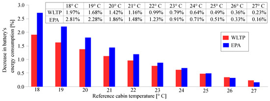 It is easy to understand that the first driving scenario is more aggressive than the second one by simulating the vehicle model in each scenario with no cabin conditioning (HVAC turned off). From Table 7, one can deduce that the specific energy required to complete the driving schedule is lower for scenario 2 () than for scenario 1 ().