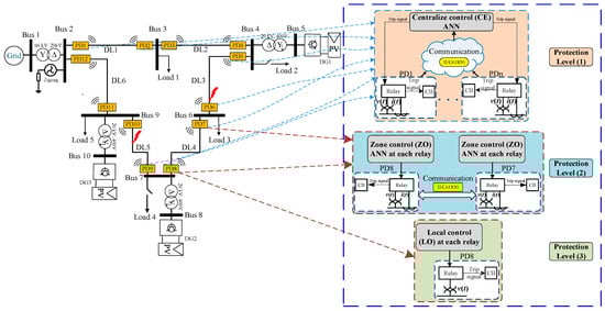 Previous research has mainly focused on communication, with no solutions for poor communication. As seen from the aforementioned studies, an integrated protection strategy that can operate for ring and radial DSs with high DG penetration in the case of reconfigurable grids is still needed. The authors’ prior study presents an AI protection approach based on three strategies [,]. The first strategy, the centralized algorithm (CE), uses grid-wide communication amongst all PDs. Furthermore, in the second strategy, known as the zone algorithm (ZO), the communication between the PDs in the same line is utilized, while the third protection strategy, called the local algorithm (LO), relies on each PD’s local measurements without relying on communication.