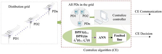 In this algorithm, every connection between the PDs and the CE is deemed to be accessible, as inputs to the CE, DPF data for the ring grid and positive-sequence current (i+) data for the radial grid are utilized in order to determine the correct course of action. This is feasible due to the short length of the lines and the insufficiency of the transversal capacitance to generate a significant current difference at both ends. The conceptual diagram of the CE controller is illustrated in Figure 2. Training for the ANN must incorporate variations in the short-circuit current and DPF of each PD. Using voltage and current, the DPF and i+ are computed locally at each PD; only the processed data are transmitted to the controller.