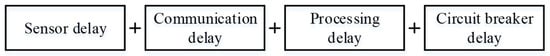 The main advantage of this system is that it performs state estimation and security evaluations while centralizing the whole system’s security into a single device []. On the other hand, problems with communications or the CE system caused by failure or safety concerns will result in a complete loss of protection until services are restored []. Additionally, communication delays must be considered. The overall communication delay comprises elements, as indicated in Figure 3, including transmission, queuing, propagation, and processing delays. The overall communication latency will be so minimal that the trip signals may be sent in less than one millisecond [].