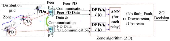 This algorithm is found at each PD and relies on communicating between the two PDs in the same line to exchange DPF data to change each PD’s status under the defective area of the grid, as shown in Figure 4. The implementation of the ZO operates concurrently with the CE. Then, the decisions of both controllers are reviewed to increase the redundancy and security of the protection system. Encrypted communication and the ability to accommodate temporary grid reconfigurations are among its benefits. The trained fault ZO ANN controller parameters are detailed in the authors’ prior works [,].