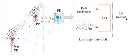 This approach does not require a complete connection between the PDs, so the protective mechanism can continue functioning even if communication is lost. As shown in Figure 5, using just the local knowledge of the PD, each PD should be able to determine if the fault is on the protected line or another line. The concept is based on utilizing each PD’s voltage and current sequence components during fault events. Figure 6 displays a ring DS’s single-line diagram with DG penetration and an LO algorithm. An algorithm for fault localization that is specific to each type of fault has been implemented. The sequence components will differ depending on whether the fault is symmetrical or asymmetrical, highlighting the importance of employing a fault classification method to determine the fault type prior to implementing the suggested LO algorithm. An ANN is selected as the instrument utilized by the LO to determine the fault type. The training and evaluation of ANNs are detailed in a prior publication by the authors [].
