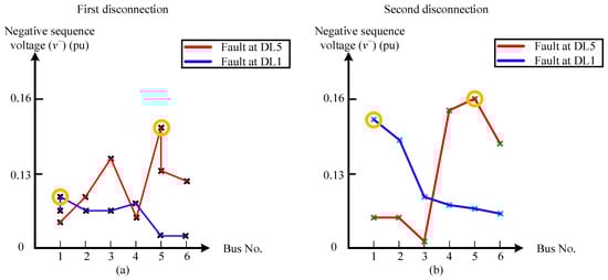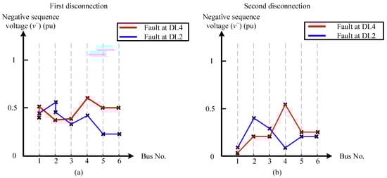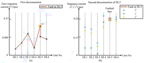 Following the disconnection of the PD with the highest voltage in the negative sequence, the grid is analyzed. In the event of a single-phase fault, the most significant value of the negative-sequence currents is obtained at the opposite end of the faulty line subsequent to disconnecting one end. This principle is employed to isolate the faulty line. Figure 16 illustrates the single-phase to ground fault zero-sequence current profile. The faulty line (DL5) has the greatest value for negative-sequence voltage (v−). Therefore, the first disconnection can be performed. The other end of the faulted line (DL5) can be disconnected using the same method. The behavior is similar when the fault is at DL1, as presented in Figure 16.