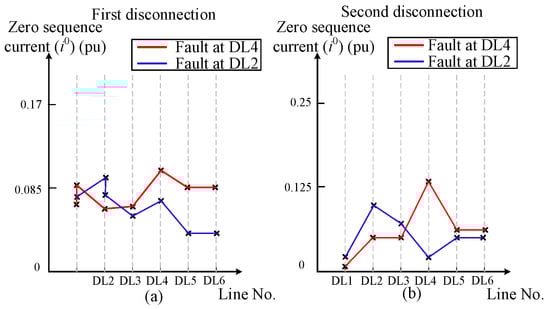Zero-sequence current profile with one DG connected at bus 3; (a) the first disconnection, (b) second disconnection when a single-phase fault at DL5.